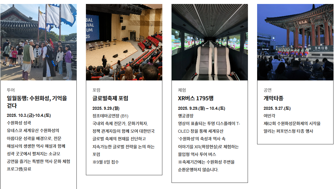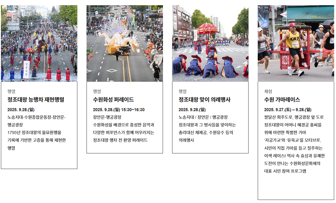 - **'정조대왕 능행차'**가 진행되는 **9월 28일(일)**에는 장안문부터 팔달문까지 주요 도로가 장시간 통제되니, 이날은 반드시 대중교통을 이용하셔야 합니다.