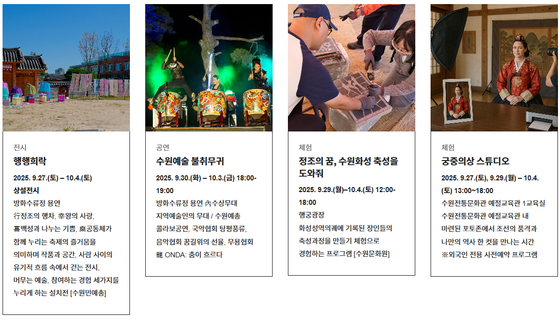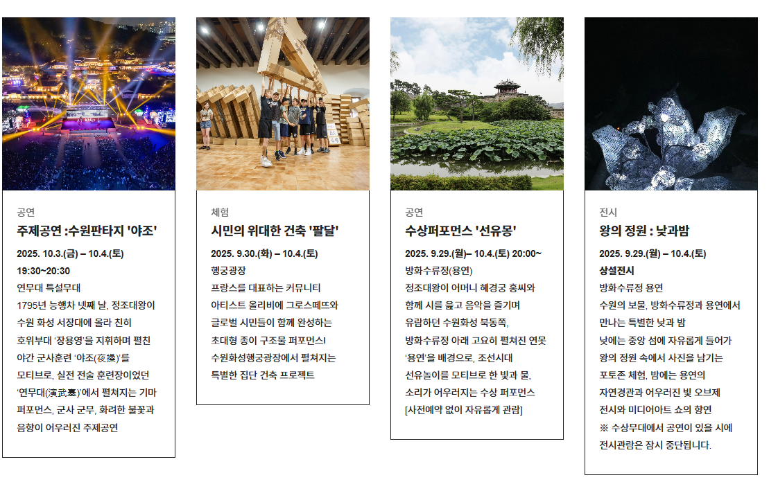 - 장소: 화성행궁 광장, 연무대 등 수원화성 일원