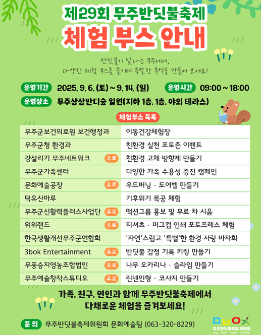 • 장소: 무주 등나무운동장, 남대천변, 예체문화관, 반딧불이 서식지 일원