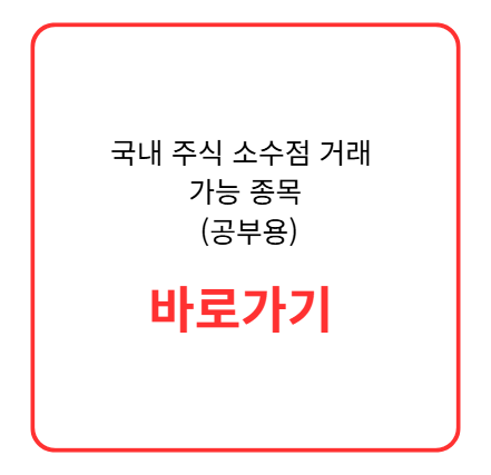 • 모든 종목이 가능하지는 않아요: 증권사별로 소수점 거래가 가능한 종목이 정해져 있습니다. 대부분 시가총액이 큰 우량주 위주로 구성되어 있습니다.