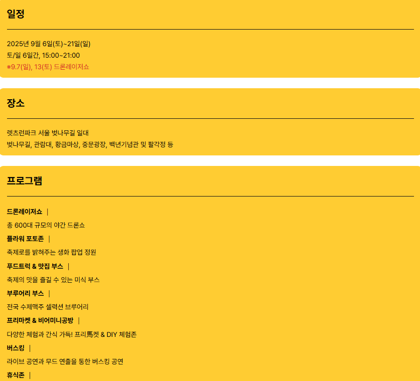 - 축제 기간: 2025년 9월 12일(금) ~ 10월 5일(일), 매주 금/토/일